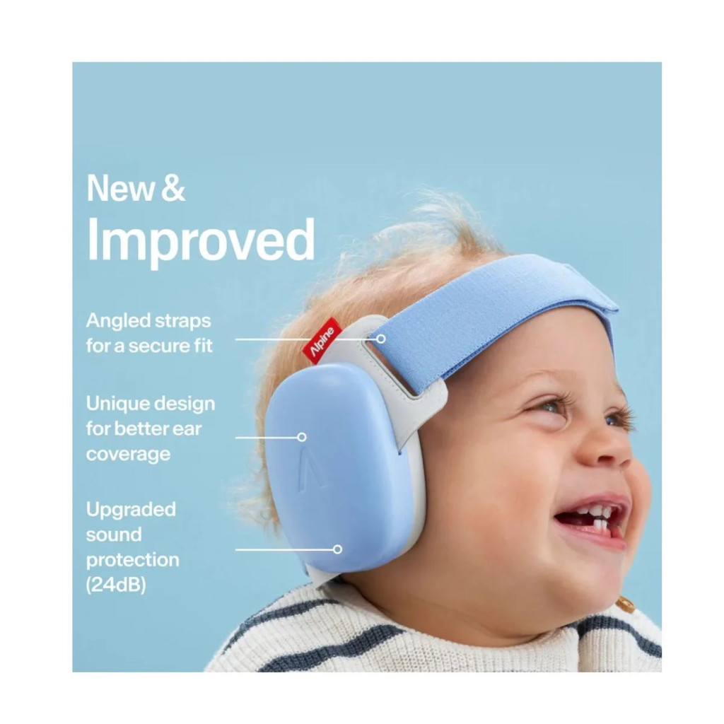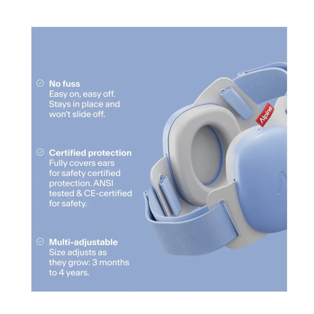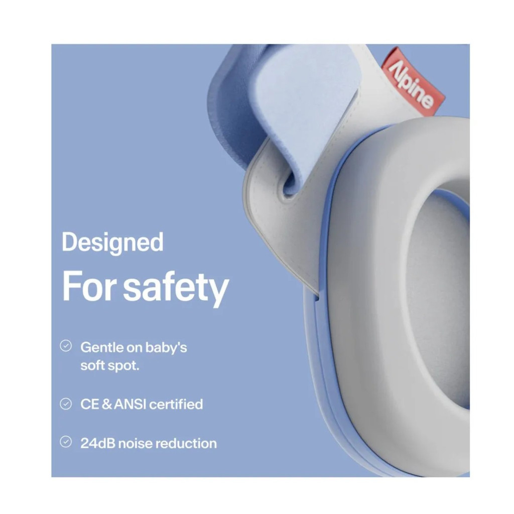 Az Alpine Muffy Baby-t úgy alakították ki, hogy soha ne legyen túl szoros. A hallásvédő sosem nyomja túlságosan a fejet. A puha, rugalmas fejpánt könnyen állítható a tépőzáras kialakításnak köszönhetően. A két különálló fültok egyszerűen a fülekhez illeszthető és rögzíthető a fejpánttal. Ez az egyedülálló fültok alkalmas csecsemőknek és kisebb gyerekeknek egyaránt. Az Alpine Muffy az idősebb gyermekek számára megfelelő.