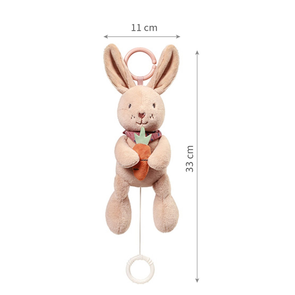 A zenélő dobozzal ellátott plüss játék puha anyagból készült, amely serkenti a tapintásérzékelést. A hosszú fülek a fogás gyakorlására ösztönöznek, a sárgarépa pedig magára vonzza a tekintetet. A kicsi fejleszti érzékeit és javítja finommotoros készségeit.