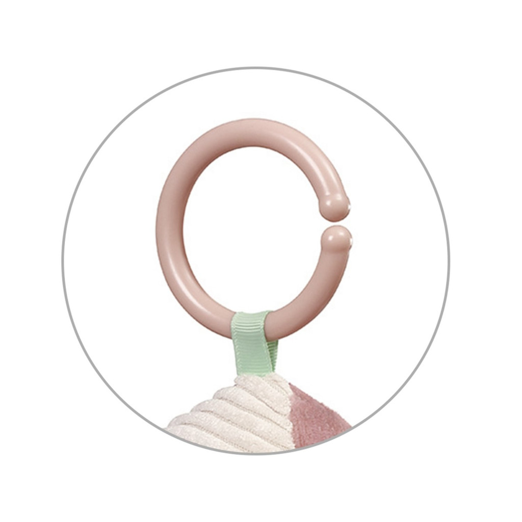 Plüss kockánk praktikus akasztóval van ellátva. Könnyen rögzíthető kiságyra, babakocsira vagy hordozóra. Gyermeked otthon, séta és utazás közben is játszhat vele.