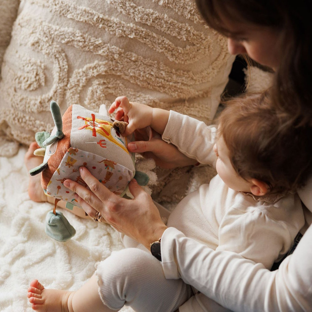A gyerekeknek szóló aktivitáskocka egy susogó játékot és egy finom csörgőt is rejt, amelyek serkentik a hallást. A kiálló szalagok és zsinórok a fogásra ösztönzik, a biztonságos tükör pedig arra ösztönzi őket, hogy felfedezzék saját tükörképüket. Az önálló felfedezés segíti gyermeked koncentrációjának és finom motoros készségeinek fejlődését.