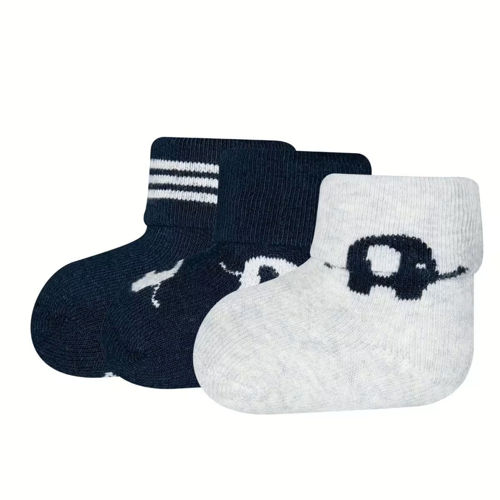 3 darabos újszülött zokni aranyos elefánt motívummal díszített mandzsettával, teljes felületén elefántmintával és egyszínű zoknikkal