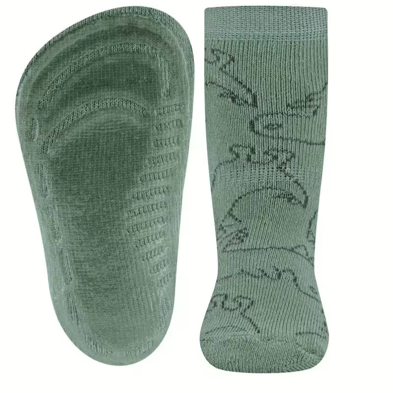 Ezek a csúszásgátló, játékos dinoszaurusz mintákkal díszített zoknik ideálisak papucs helyettesítésére. A kiváló minőségű kidolgozás és az ergonomikus szilikonbevonat tökéletes illeszkedést és megbízható védelmet biztosít a csúszás ellen sima padlón. A zoknik tartós pamut anyaga és rugalmas mandzsettája szintén kényelmes viseletet garantál.