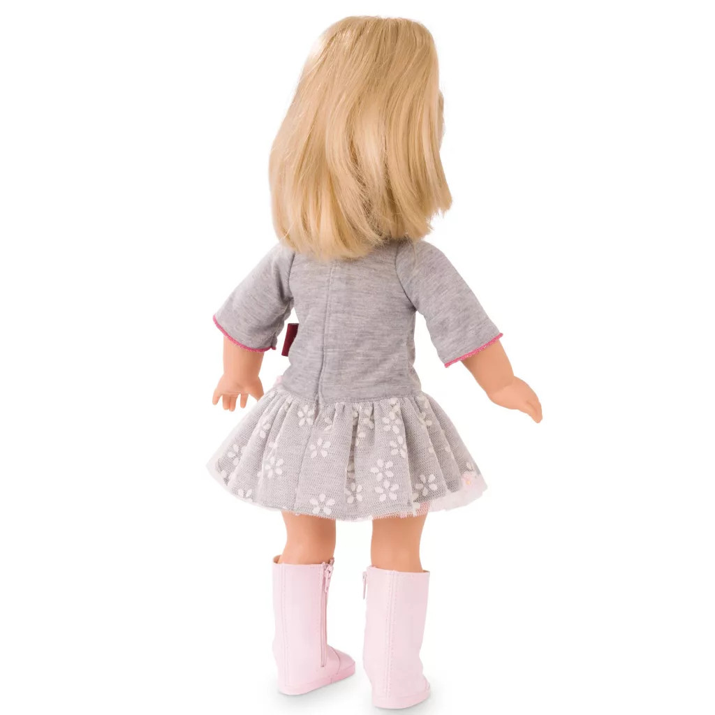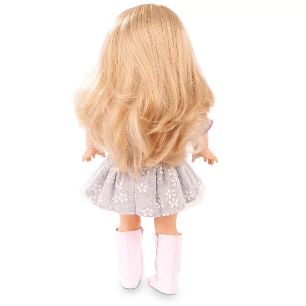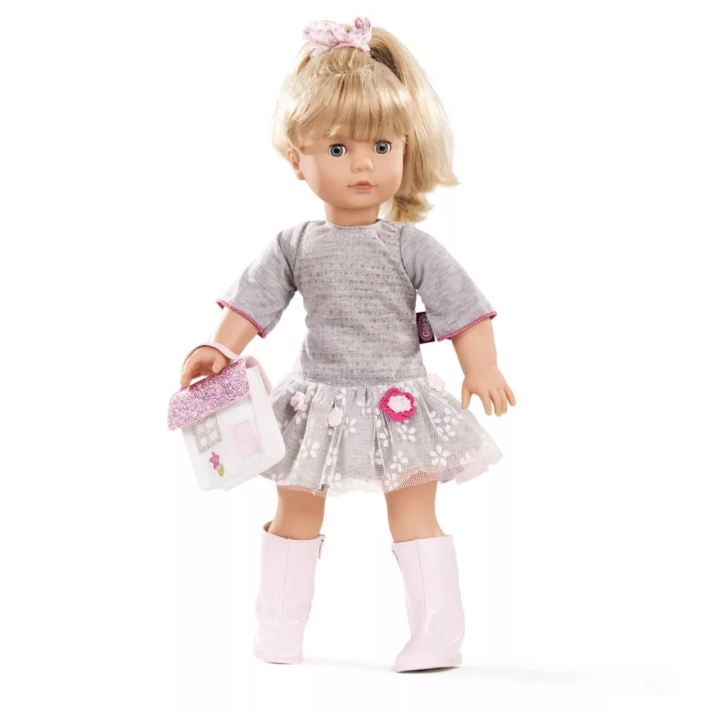Fésülhető, puhatestű Götz baba. Jessica nagyon izgatott, az idei első iskolai ünnepségre készül! Kényelmes ruhát választott, tüllszoknyával, rajta hímzett virágokkal.