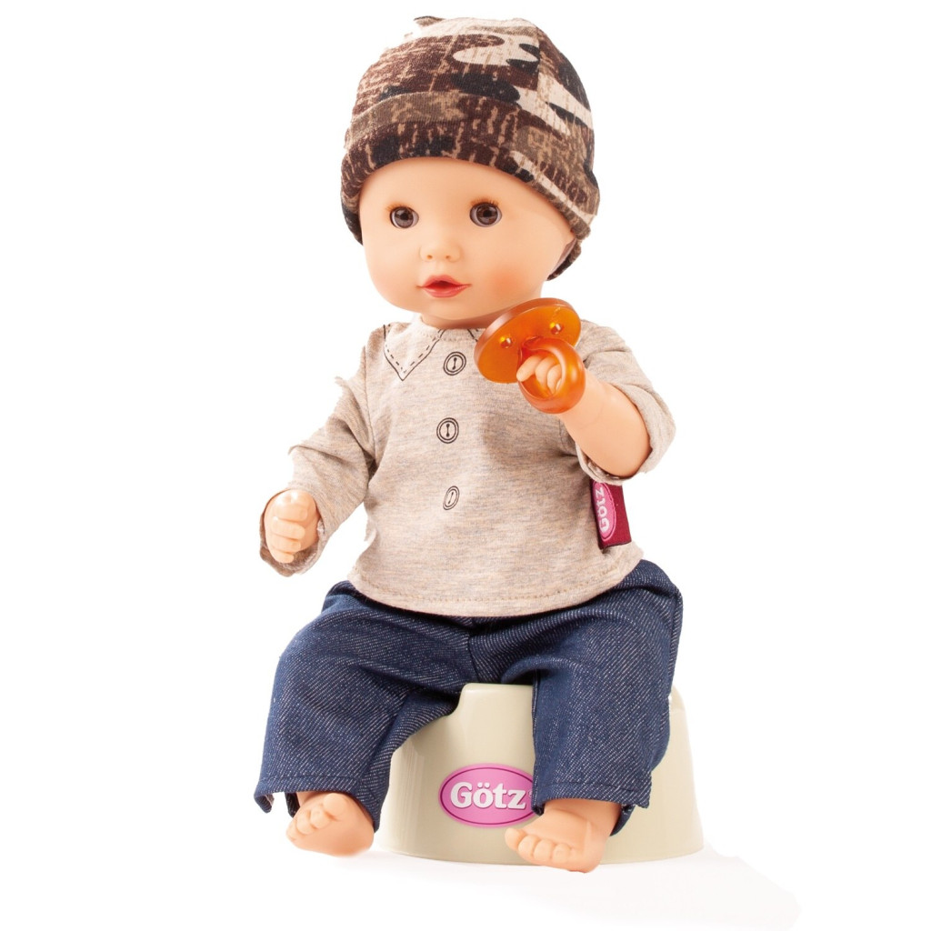 Kiváló minőségű fürdethető Götz baba. Haj nélküli kivitel, aki alvós barna szemmel rendelkezik. 33cm magas.