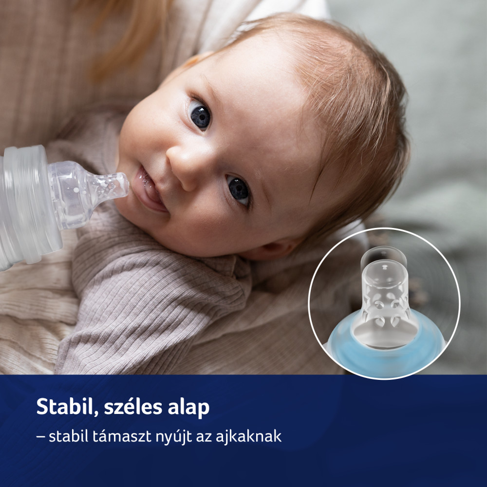 A vastagabb szilikonból készült stabil alap biztosítja az ajkak helyes elhelyezkedését az etetőcumin, és megakadályozza a cumi megrágását.