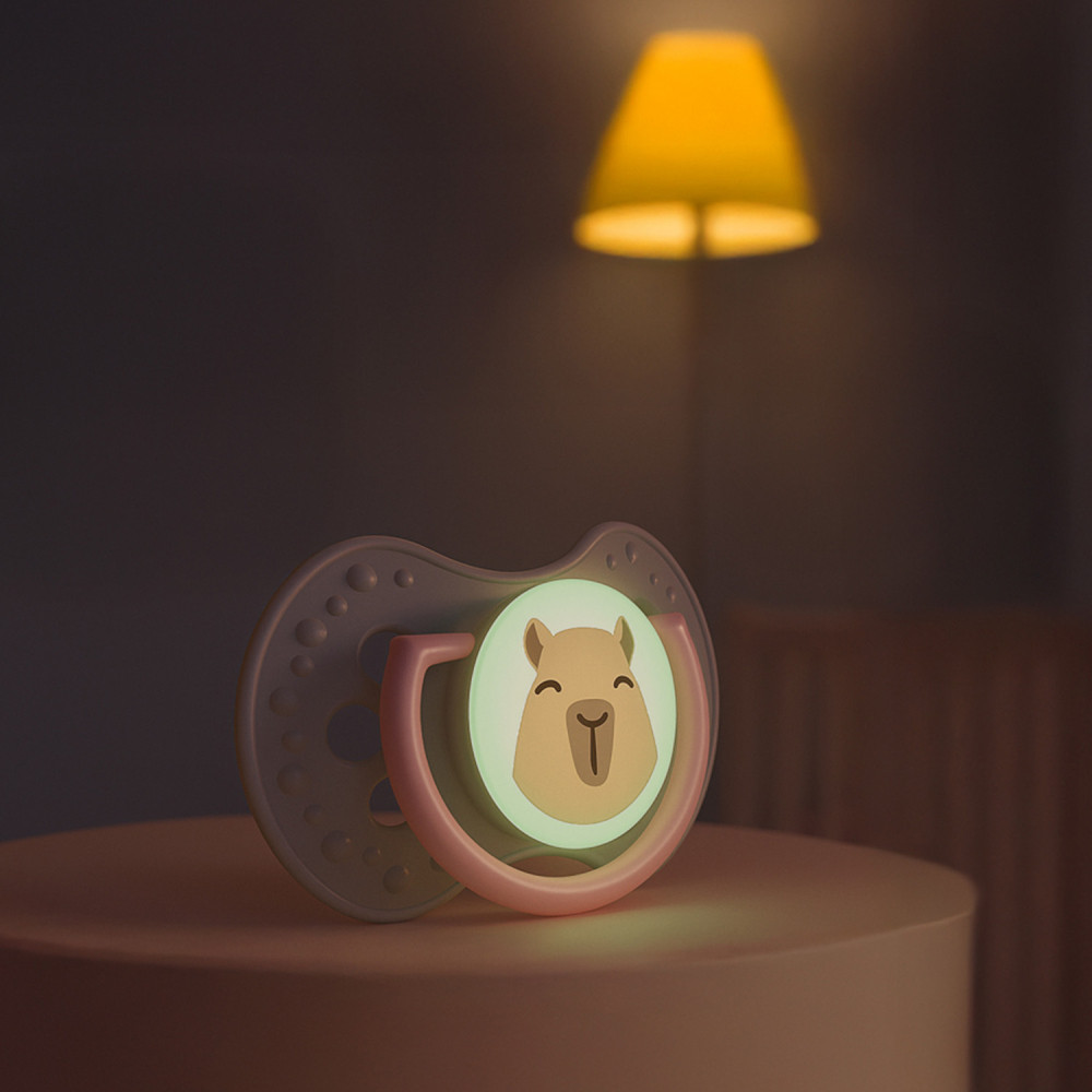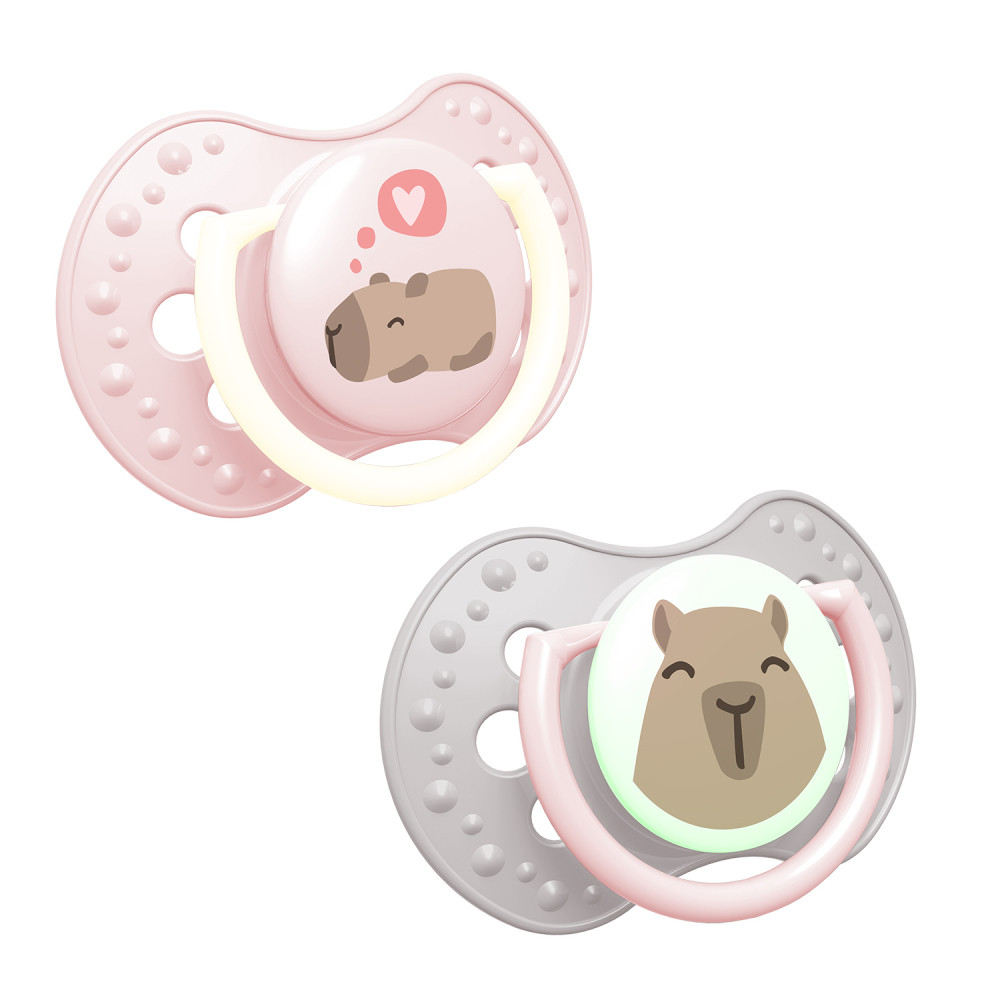 A szett 2 cumit tartalmaz – az egyik cumi fogantyúja, a másik középrésze világít a sötétben.