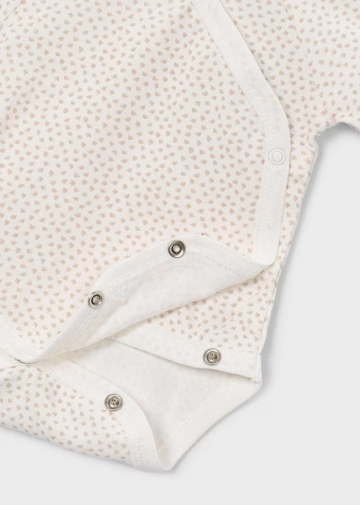 Két minőségi kényelmes body a Mayoraltól. Hosszú ujjú body v alakú nyakkivágással, patentos rögzítéssel. Mindkét body anyaga: 95% pamut, 5% elasztán.