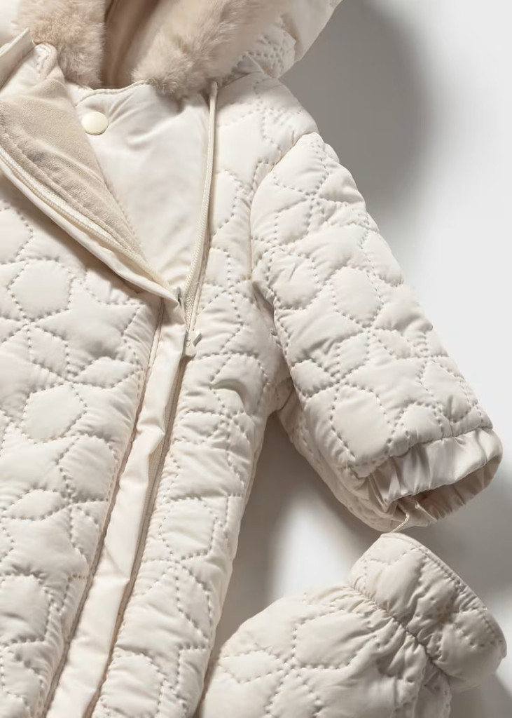 Hosszú ujjú overál újszülötteknek. A kapucni műszőrmével díszítve. Elöl, középen cipzáras. Textil külső anyag steppelt hatással.