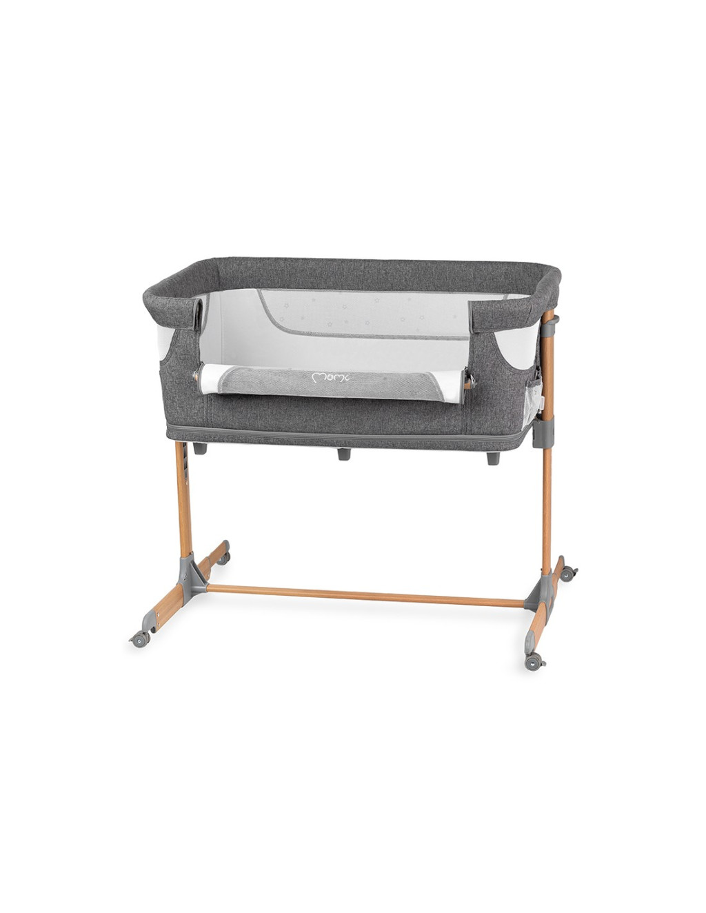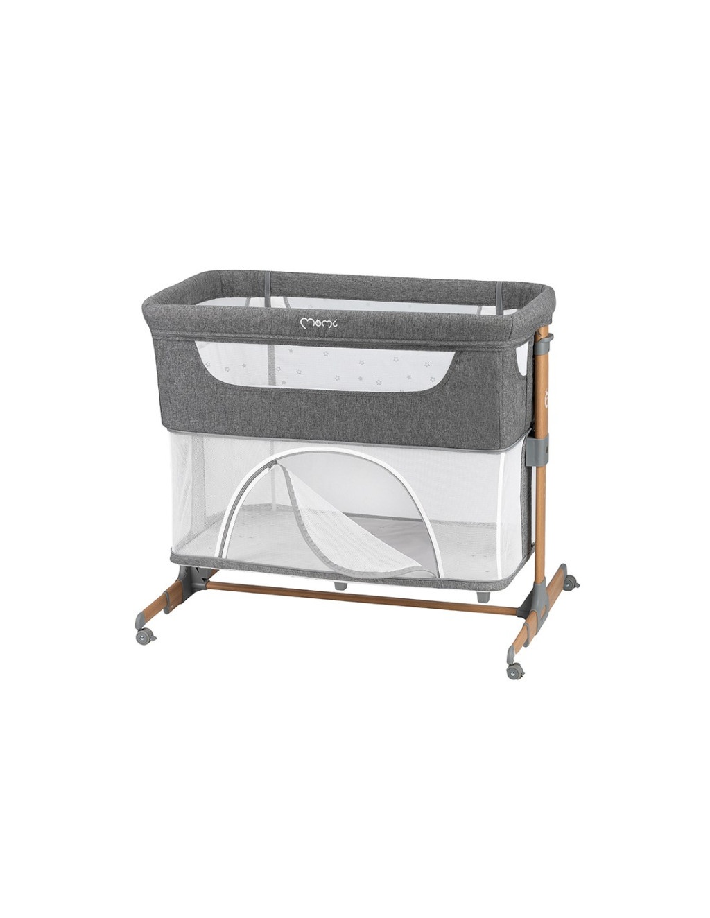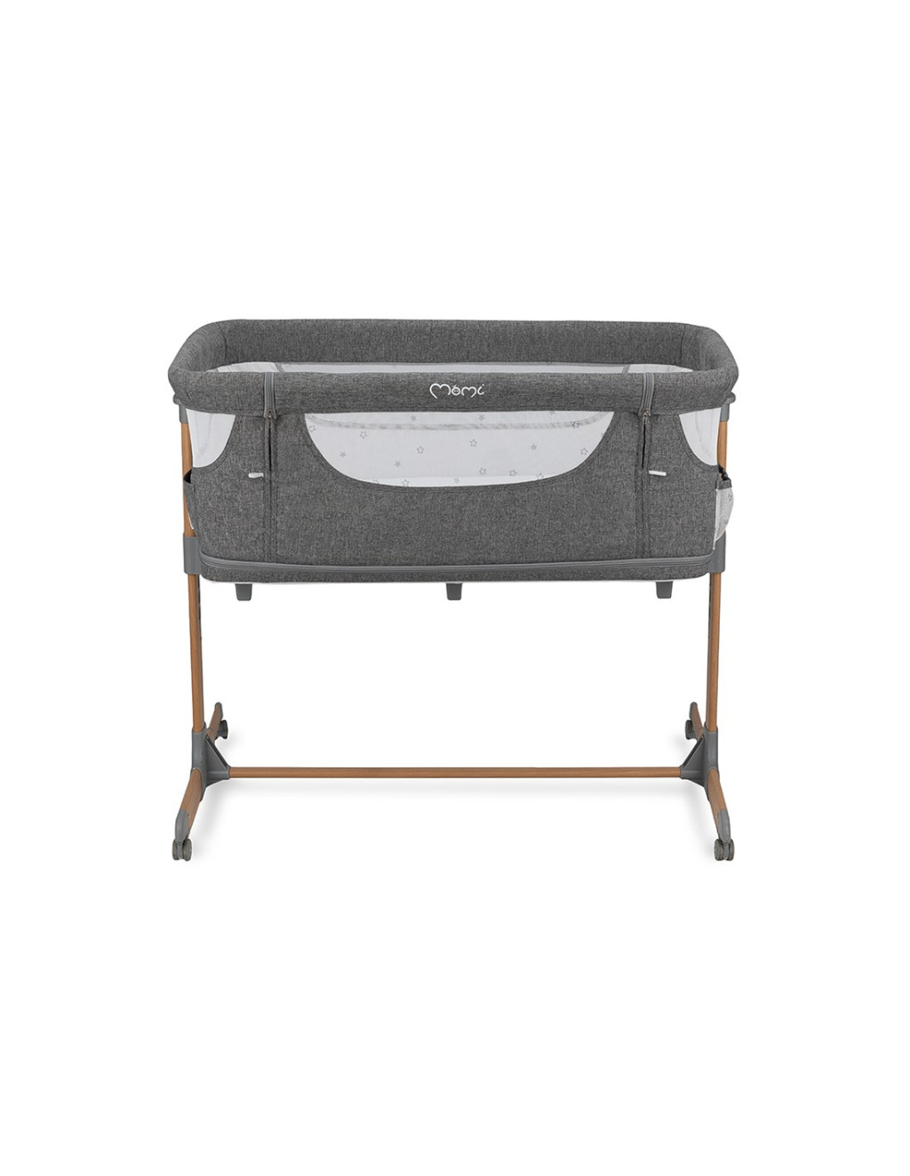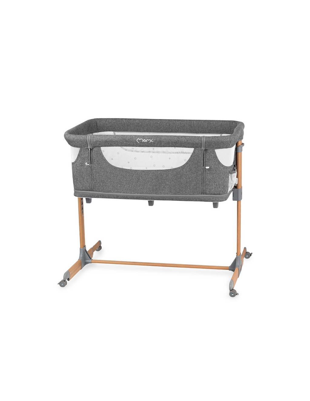 A MoMi SMART BED oldalán található egy zseb, amelyben a legszükségesebb holmikat tárolhatja. Az oldalsó cipzáras bejárat hasznos lesz az idősebb gyermekek számára, akik járókát használnak. Amikor a gyermek kicsi és felső alvási pozíciót használ, az alsó, cipzáras kosarat használhatja olyan alapvető dolgok tárolására, mint a pelenka vagy a nedves törlőkendő.