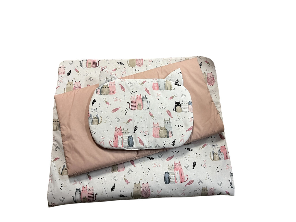Wikids 3 részes ágyneműgarnitúra #mályva bézs cicás vászon-mályva vászon