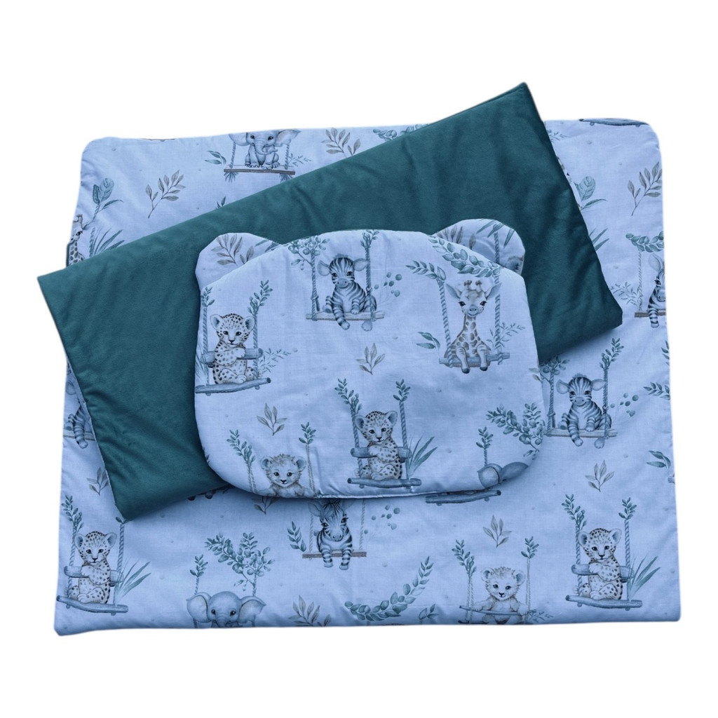 Tartalma:1 db kispárna 30 x 40 cm, 1 db babatakaró 70 x 90 cm 1 db gyerek takaró 80 x 135 cm Anyag összetétel: eleje 100 % mintás pamut másik oldal pihe-puha wellvet béléssel, töltet 100% polyészter Az ár nem tartalmazza a képen szereplő kiegészítőket!