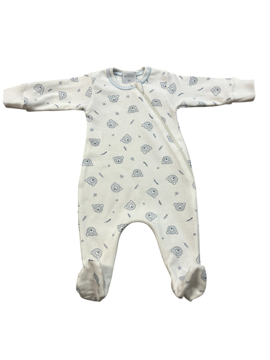 56-os méretű, cipzáras, hosszú ujjú, pamut Wikids rugi. 100% pamut anyagú. Mosógépben 30°-on mosható.