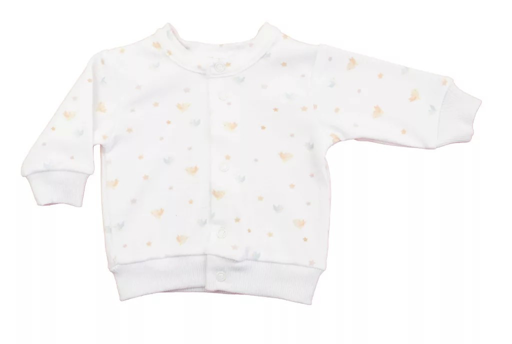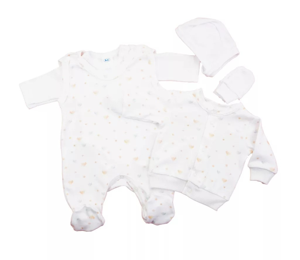 A csomag tartalmaz egy ujjatlan vállon patentos rugdalózót telenyomott madárkás mintával , hosszú ujjú, egyszínű ,vállon patentos baba bodyt és egy elöl patentos, telenyomott, madárka mintás baba kocsikabátot ami tökéletes választás lesz a hűvösebb napokra. A csomagban található baba sapka és a baba kesztyű pedig hozzáadja az utolsó simításokat ehhez az elegáns készlethez. Az összes darab 100% pamutból készült, ami puha és kényelmes viseletet biztosít a babának. Ez a magyarországi termék I. osztályú minőségű, és a termékben használt nikkelmentes patentok nem okoznak allergiás reakciót a nikkellel szemben érzékeny babákban.