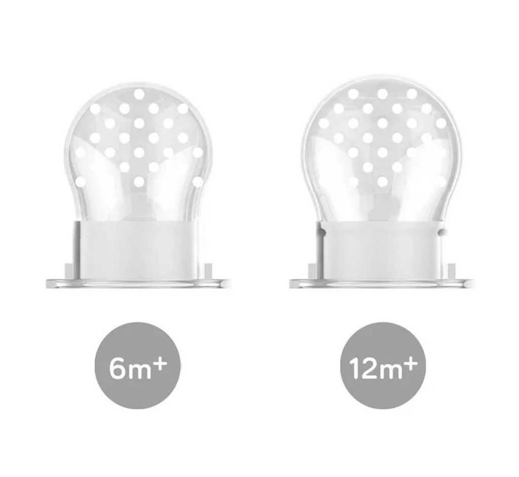 A készlet két (egy 6 és egy 12 hónapos kortól használható) lyukacsos etetőcumit tartalmaz, hogy a terméket a gyermek életkorához és képességeihez igazíthasd.
