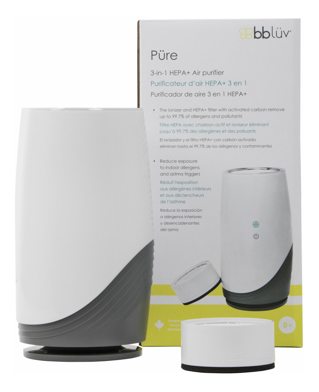 A Püre egészségesebb levegőminőséget és kényelmes környezetet biztosít az egész család számára. Fejlett légtisztítónk tanúsított HEPA+ szűrőket használ aktív szénnel és ionizáló technológiával, amely eltávolítja az allergének és szennyező anyagok akár 99,7%-át. A HEPA+ szűrő használata különösen ajánlott allergiás vagy légzési problémákkal küzdők számára.