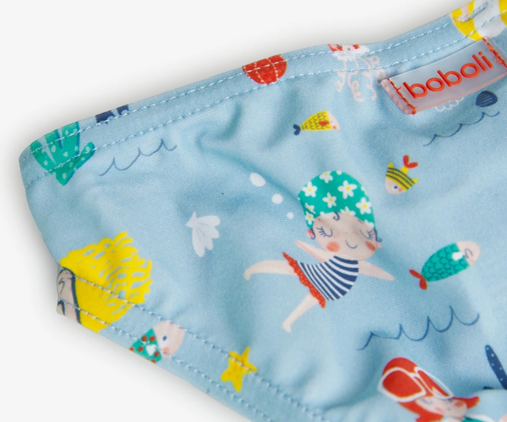 Boboli lányka fürdőbugyi. Mosógépben 30°-on mosható. Külső anyaga: 80% poliamid, 20% elasztán. Bélése: 100% poliészter.
