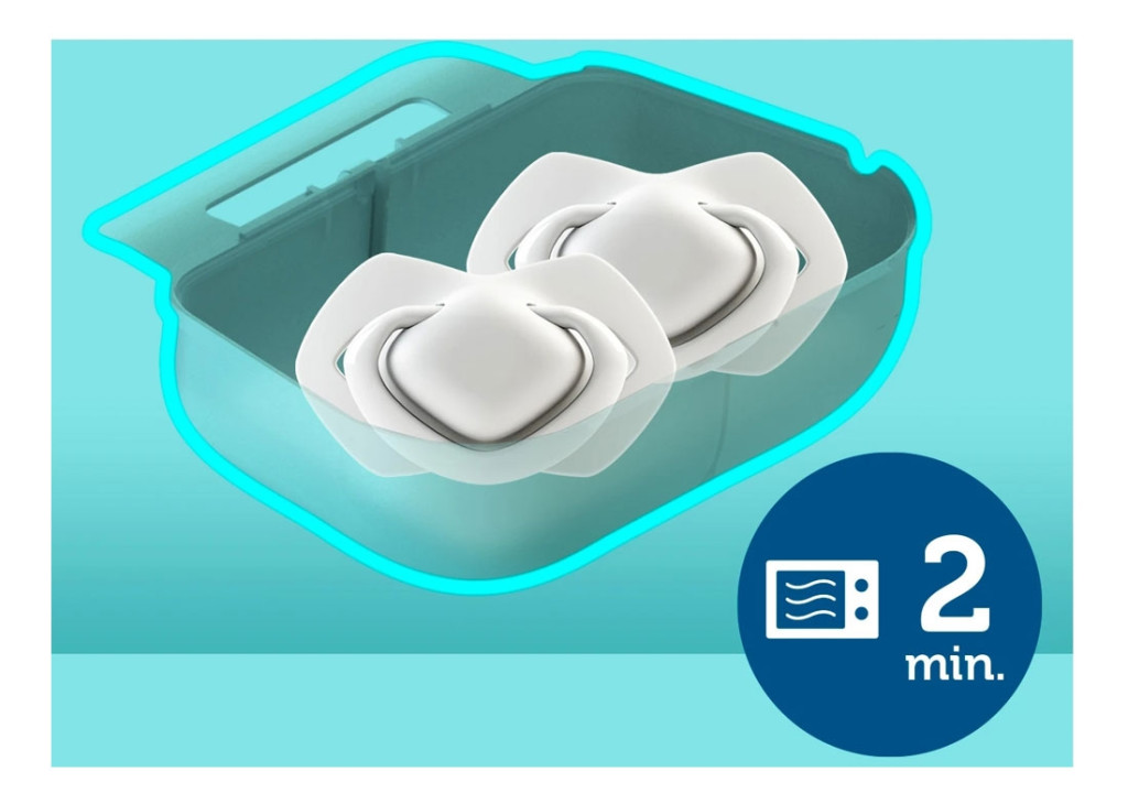 A könnyű tapintású cumik könnyen tisztán tarthatók a modern toknak köszönhetően, amely akár tárolásra, akár gyors és kényelmes fertőtlenítésre használható a mikrohullámú sütőben. Egy kis víz és 2 perc elég ahhoz, hogy a cumik higiénikusan tiszták legyenek.