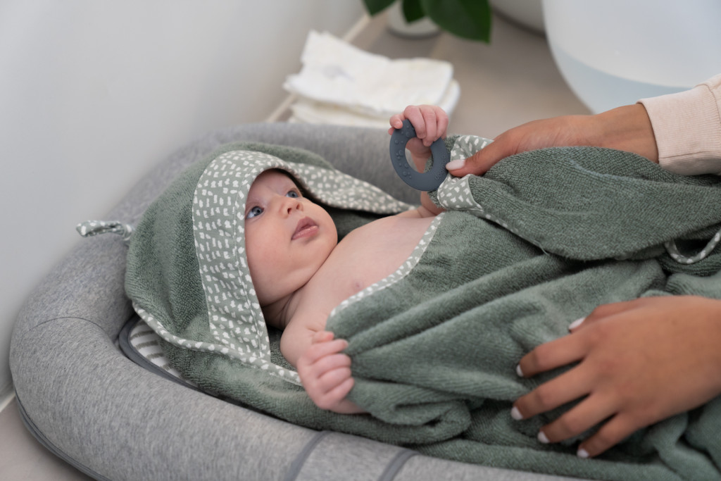 Fürdés után a baba kényelmesen bebugyolálható a fürdőlepedőbe, a szilikon karika pedig rágokaként is szolgál a picinek.