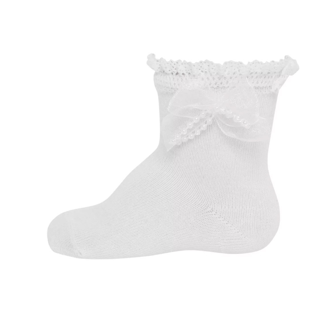 Egy pár,fodros csipkével és masnival dekorált 17-18-as méretű, kényelmes és csinos Ewers zokni. Újszülött méret, a 68-as méretű rugdalozót viselő babának a lábára megfelelő méret.