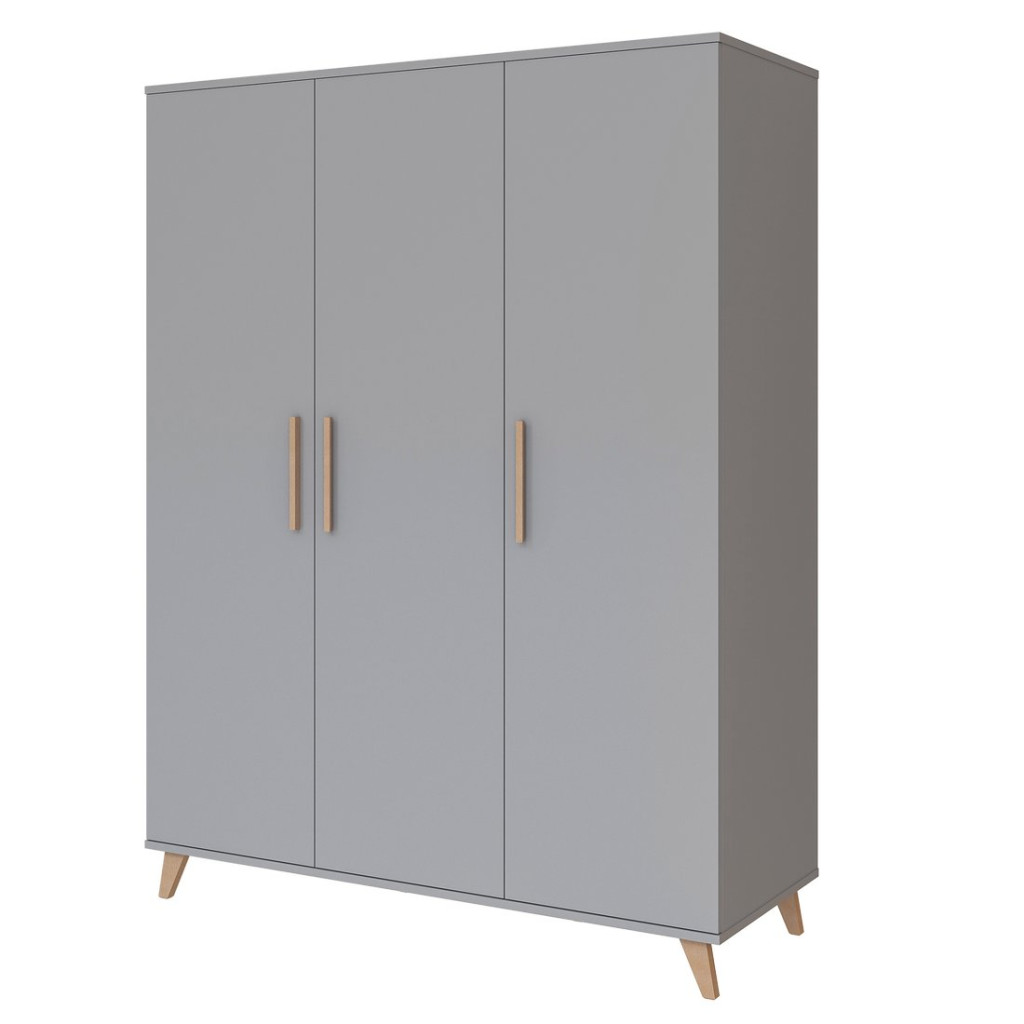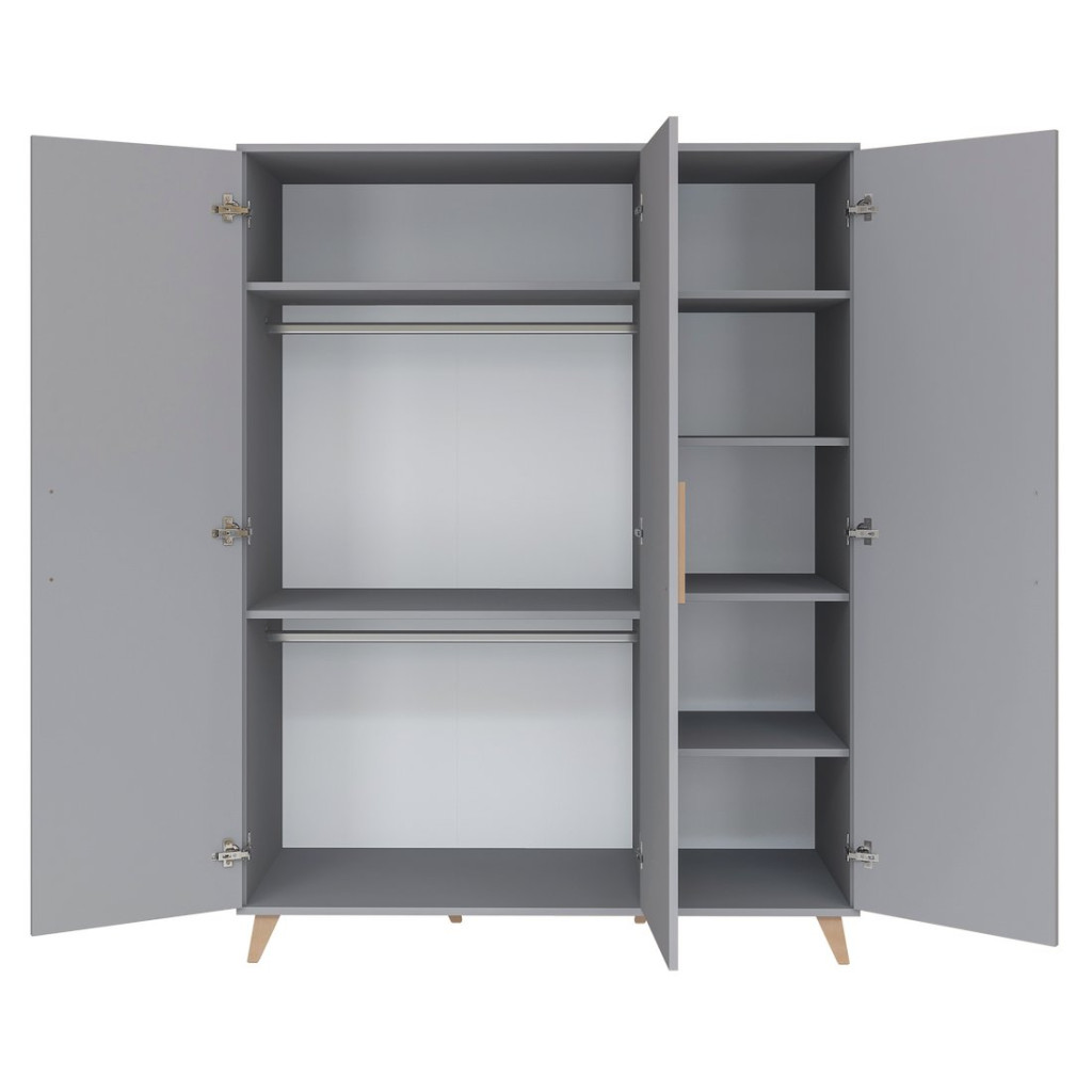 Igaz, hogy a nagyobb szekrény nagyobb helyet is foglal, cserébe rengeteg tárolási lehetőséget kínál. Az ajtók hosszúkás fogantyúkkal nyílnak, melyek meghatározó elemei a bútornak. A szekrény belső részének nagyobb elosztásnál 2 db akasztórúd és 2 db fix polc áll a rendelkezésedre babád holmijainak elrendezésére, míg a harmadik elosztás végig polcozva van, ott összesen 4 db polc áll rendelkezésre pakoló felületként. Továbbá újszülött kortól akár felnőttkorig van lehetőség használni a szekrényt. A szekrény stabil, kecses lábainak
