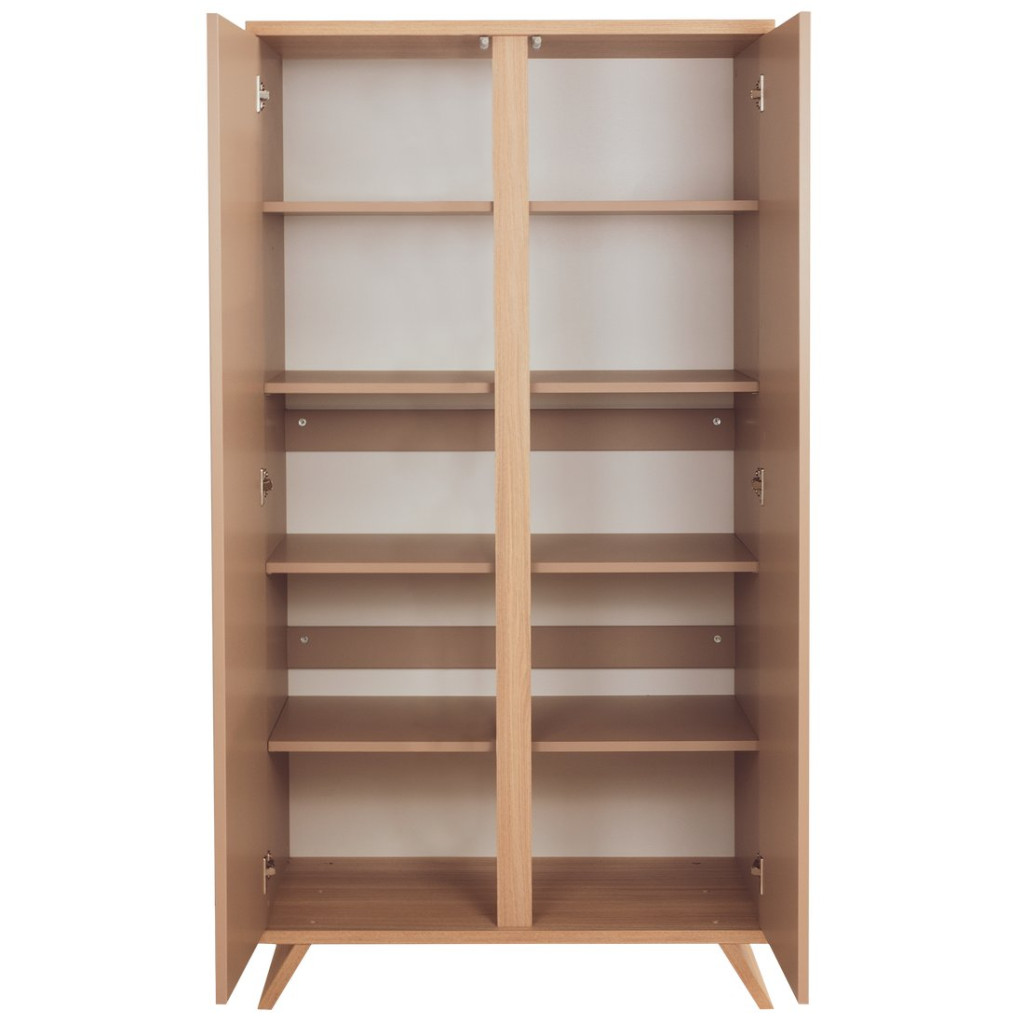 A Sienna Cappuccino 2 osztású szekrény a babaszoba nélkülözhetetlen tároló bútoraként minden igényt kielégít. Praktikus belső akasztós kialakításának köszönhetően átláthatóan és könnyen kezelhetően tudod tárolni kisbabád ruháit. Továbbá a szekrényen belüli felső polc kialakítás a szekrény méreteinek kihasználását maximalizálja. Igény szerint további 3 db polccal is kiegészíthető.