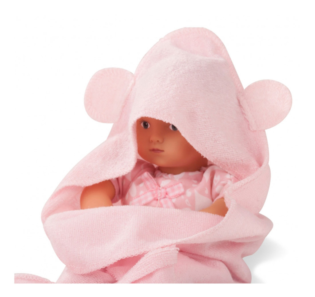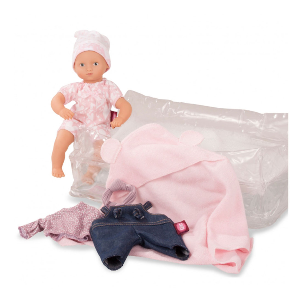 Végre eljött a fürdés ideje. A medencét gyorsan felállítják, és a kicsi azonnal beleül. A csobbanás után Mini Aquini kényelmes kapucnis törölközőjében lazít, és amint megszáradt, felveszi farmernadrágját, virágmintás ingét és természetesen a fejpántját. Érezd jól magad!