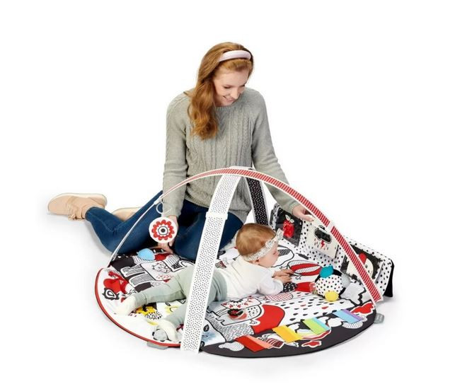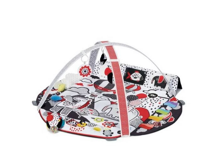 A szettben található kártyákat egy speciális műanyag zsebbe lehet tenni a szőnyeg oldalán. Különböző formákat mutatnak és kontrasztosak. A szőnyeg oldala felemelhető, hogy arra ösztönözze kisgyermekét, hogy emelje fel a fejét és edzze a nyakizmait.