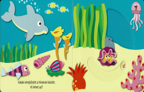A lapozó könyv egy varázslatos utazásra hívja a kicsiket a tenger mélyére, ahol a különböző tengeri lények elbújtak a hínárok, hajók és bálnák mögött.