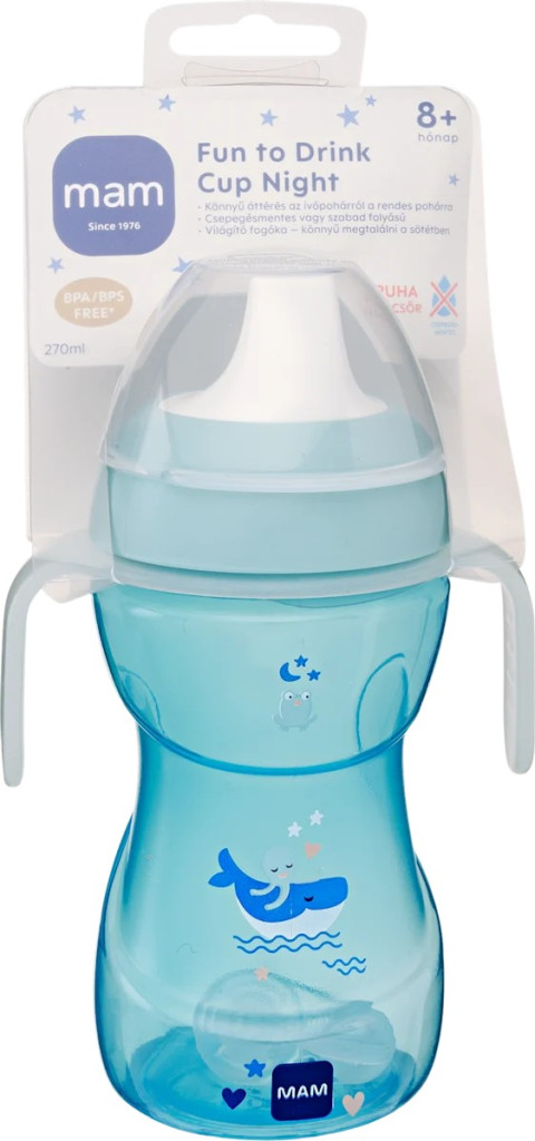MAM Fun to Drink éjszakai ivópohár 8 hónapos kortól, 270 ml-es kiszerelésben, amely segíti a babákat az önálló ivás elsajátításában. Az ivópoharak a babák fejlődési szakaszaihoz igazodnak, lehetővé téve a zökkenőmentes átmenetet a szoptatásról vagy a cumisüvegről a pohár használatára. A MAM ivópoharak BPA- és BPS-mentes anyagokból készülnek, így biztonságosak a babák számára. A kemény ivócsőr és a csepegésmentes szelep megkönnyíti az ivást, míg a fogóka, amely világít a sötétben, segít a babáknak a pohár könnyű kezelésében.