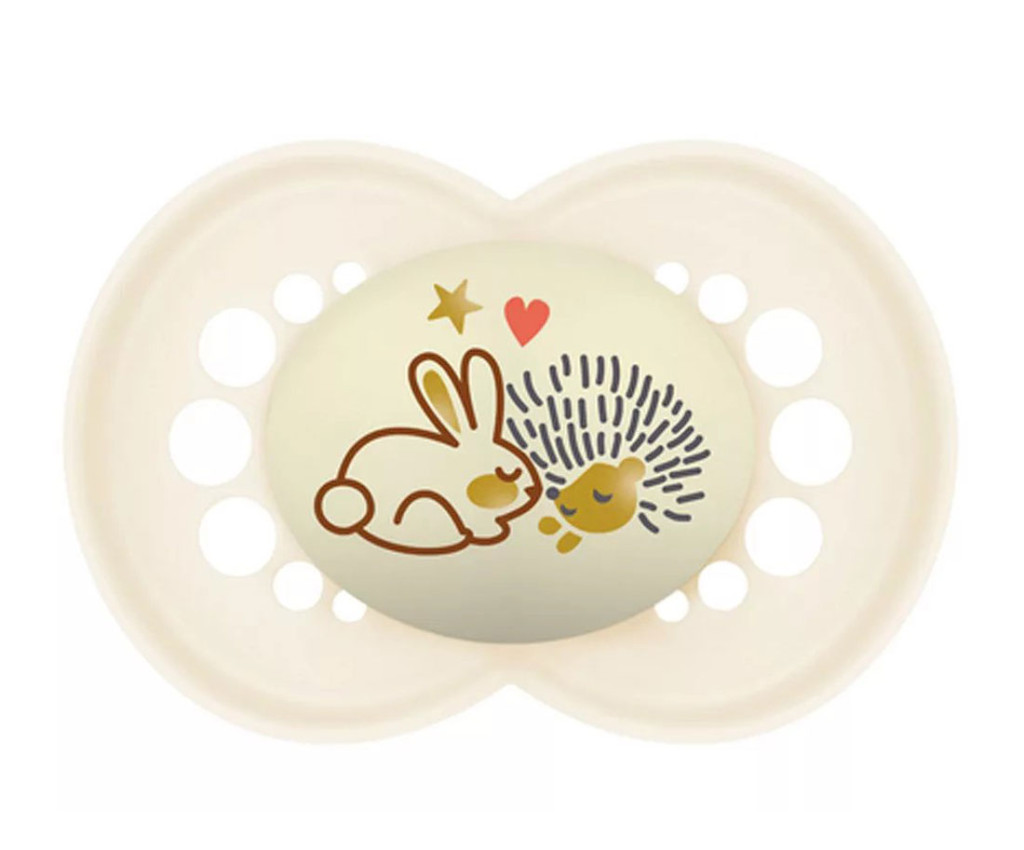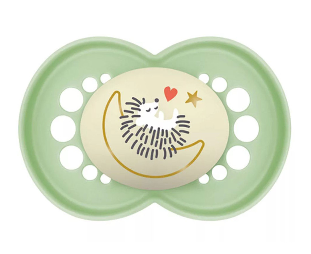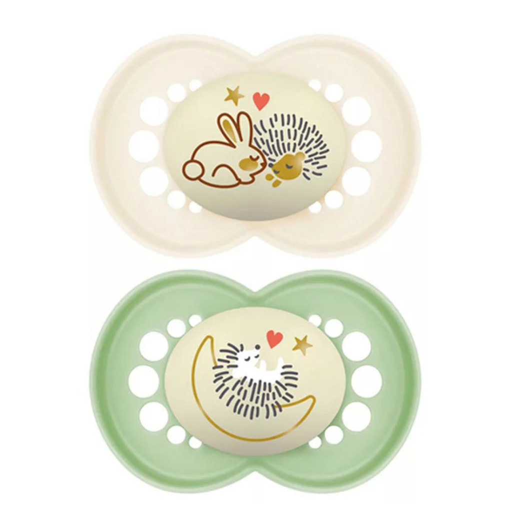 16 hónapos kor felett javasolt, 2 darabos, sötétben világító Mam Original Night szilikon játszócumi. BPA mentes.