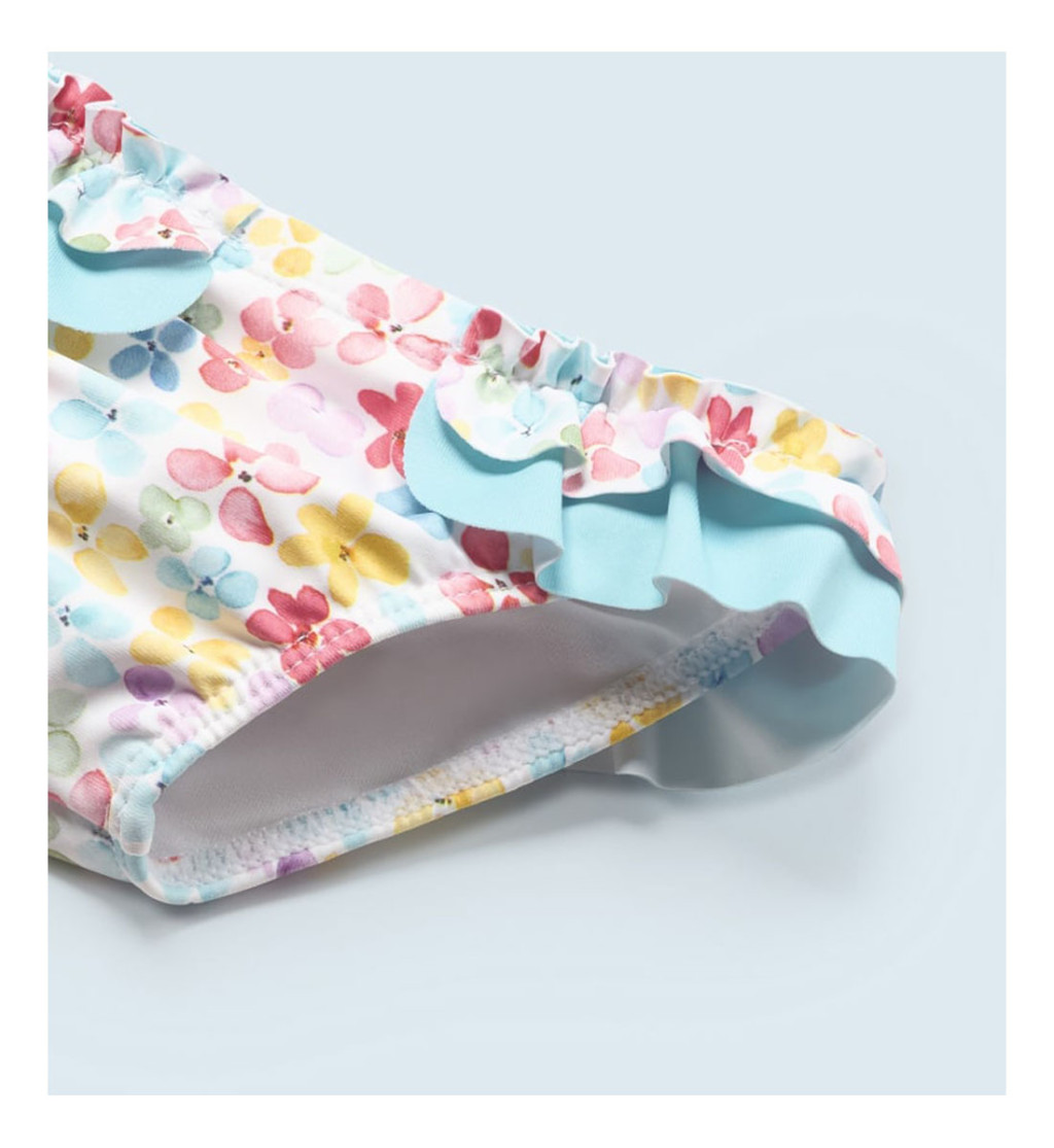 Vidám fürdőruha szett három egymáshoz illő darabbal.