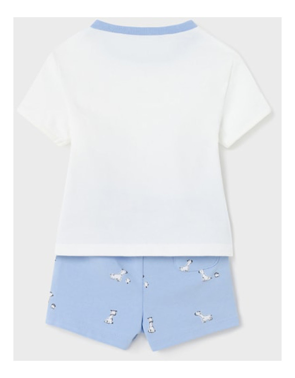 Fenntartható pamutot tartalmaz. A négyrészes szett két kombinálható részből áll. Mindkét rész tartalmaz egy rövid ujjú pólót és egy shortot.