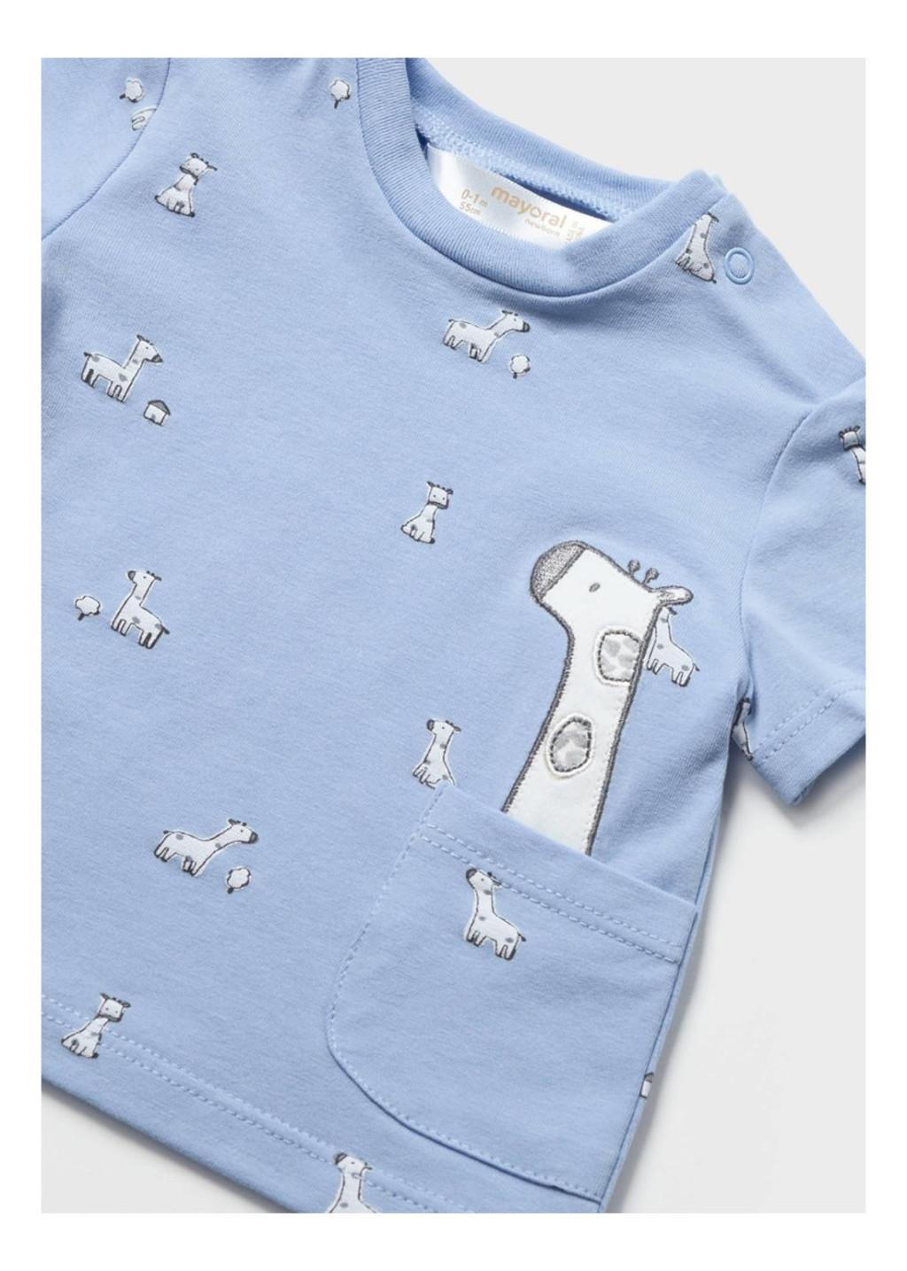 Az újszülött számára készült rövid ujjú póló a vállon gombos, hogy a ruhát könnyen fel lehessen adni.
