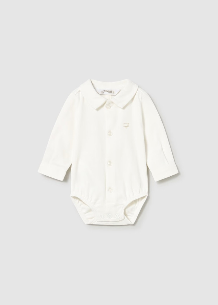 Hosszú ujjú body újszülötteknek. Inggallér. Patentgombos rögzítés az ülepnél a könnyű öltöztetés érdekében. Gombos rögzítés elöl.