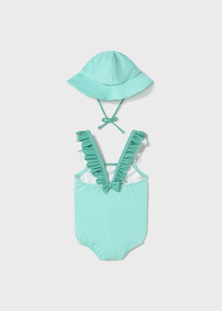 Újszülött fürdőruha pántokkal és fodros részekkel. Patentos gombok az üleprészen a könnyű felvétel érdekében. Újszülött sapka puha, könnyű anyagokból, amelyek hűvös pillanatokat biztosítanak a legforróbb tavaszi és nyári napokon. UPF 40+ tanúsítvánnyal rendelkező anyag, körülbelül 97,5%-os UV-védelmi faktorral. Ideális a kicsi védelmére a nap káros sugarai ellen.