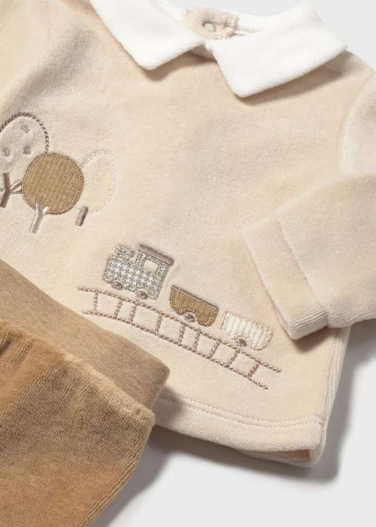 Kétrészes szett újszülötteknek, amely egy hosszú ujjú pulóverből és hozzá illő leggingsből áll. A pulcsi inggalléros, hátul patenttal rögzíthető. A nadrágnak gumis derékrésze van és lábfejes kialakítása.