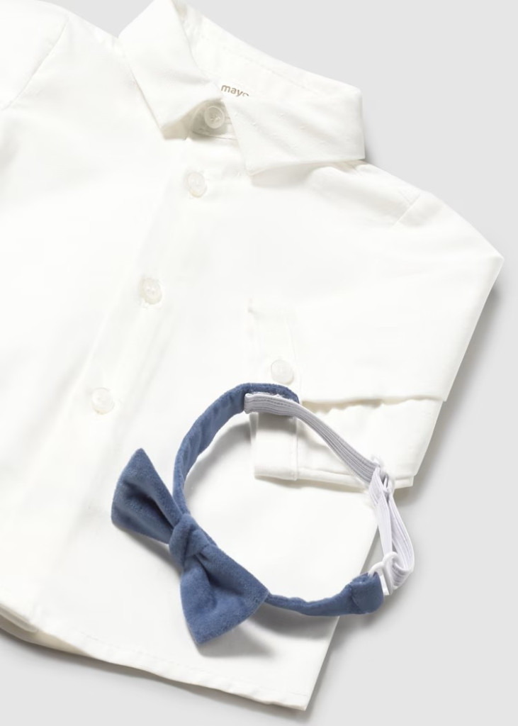 Újszülött ing hozzáillő csokornyakkendővel. Hosszúujjú ing újszülötteknek. Inggallér. Elöl gombos záródás. Elegáns újszülött csokornyakkendő batikolt anyagból, állítható záródással a kényelmes illeszkedésért. Tökéletes kiegészítő, amely elegáns megjelenést kölcsönöz az ünnepi öltözékeknek.