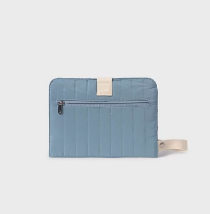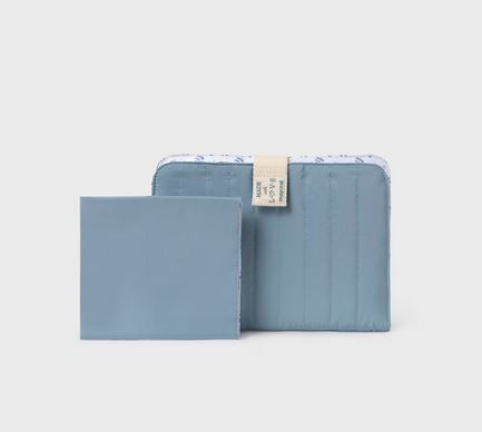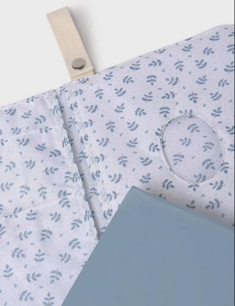 Praktikus készlet, amely egy párnázott törlőkendőtasakból áll, különböző rekeszekkel, valamint egy hordozható pelenkázómatracból.