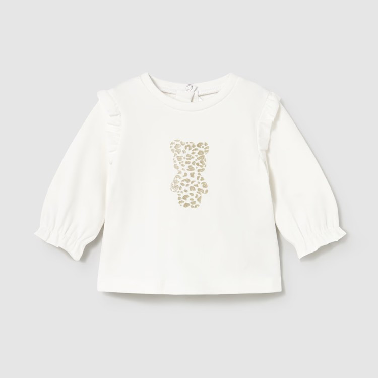 Hosszú ujjú póló újszülött kislánynak, fodros vállrésszel. Környakú, patentgombos záródás hátul.