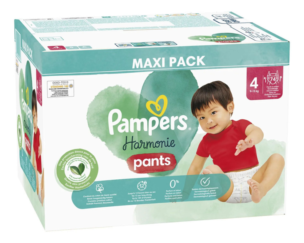 4-es méretű Pampers Harmonie bugyipelenka, 9-14 kg súlyú babáknak. 74 db-os kiszerelés.