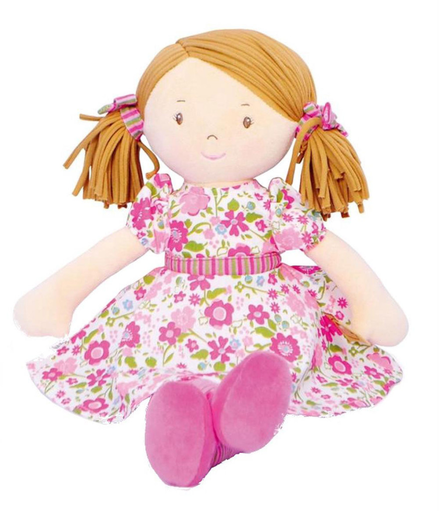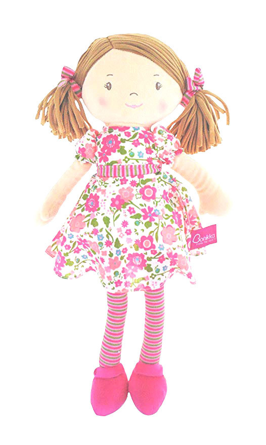Tikiri Bonikka rongybaba #Fran barna haj rózsaszín-zöld ruha #5170