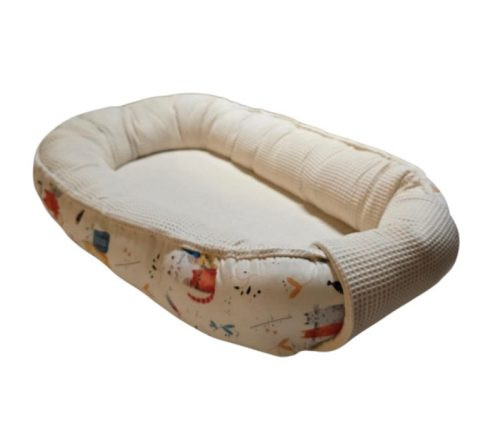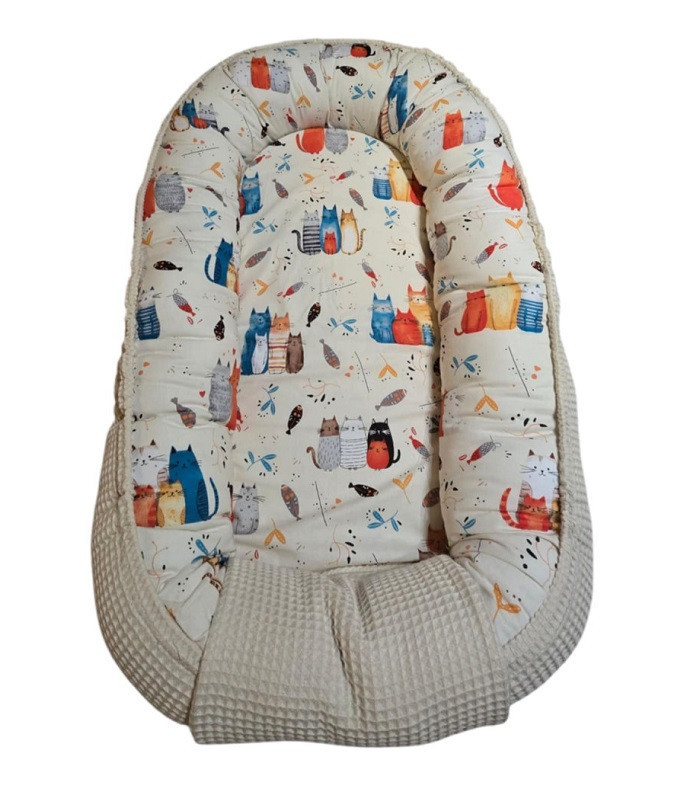 A babafészek waffle pamutból készült, belső oldalán pedig finom tapintású, cica mintás pamutvászon teszi igazán különlegessé.