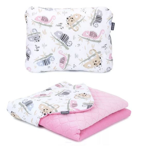 Az ágynemű szett mérete: takaró: 75x100 cm, párna: 30x38 cm.