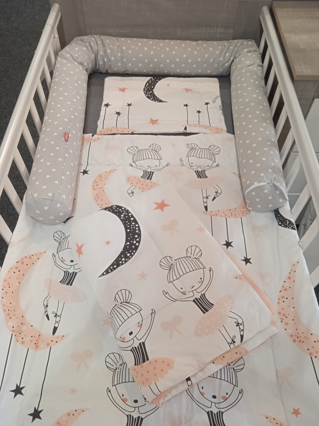 3 részes ágyneműgarnitúra. Tartalma: 30x40cm-es kispárna, 70x90cm-es kis takaró, 80x135cm-es nagy takaró. Külső és belső anyag 100% pamut, töltet 100% poliészter. Egybevarrt töltettel, egyben kimosható verzió. FONTOS! Az ár nem tartalmazza a képen szereplő további kiegészítőket (fejvédő, dekorációs elemek stb.), kizárólag az ágyneműgarnitúrára vonatkozik.