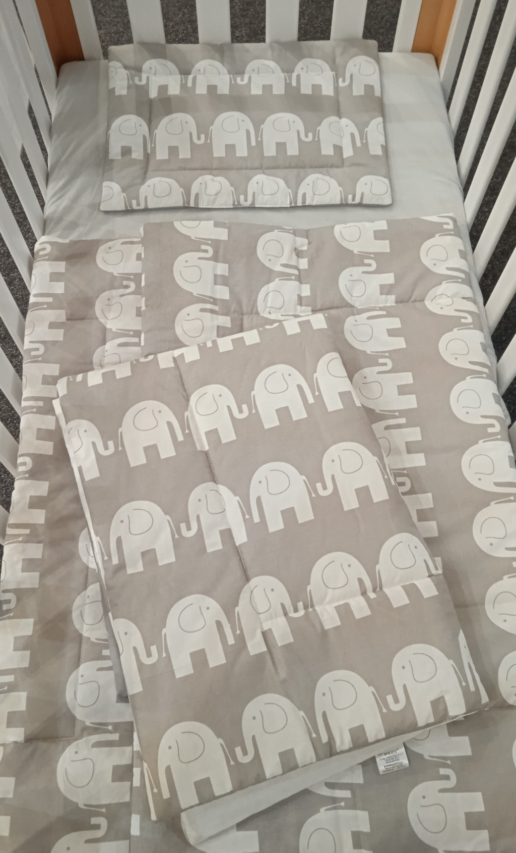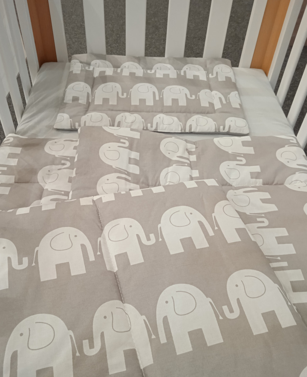 3 részes ágyneműgarnitúra. Tartalma: 30x40cm-es kispárna, 70x90cm-es kis takaró, 80x135cm-es nagy takaró. Külső és belső anyag 100% pamut, töltet 100% poliészter. Egybevarrt töltettel, egyben kimosható verzió. FONTOS! Az ár nem tartalmazza a képen szereplő további kiegészítőket (fejvédő, dekorációs elemek stb.), kizárólag az ágyneműgarnitúrára vonatkozik.