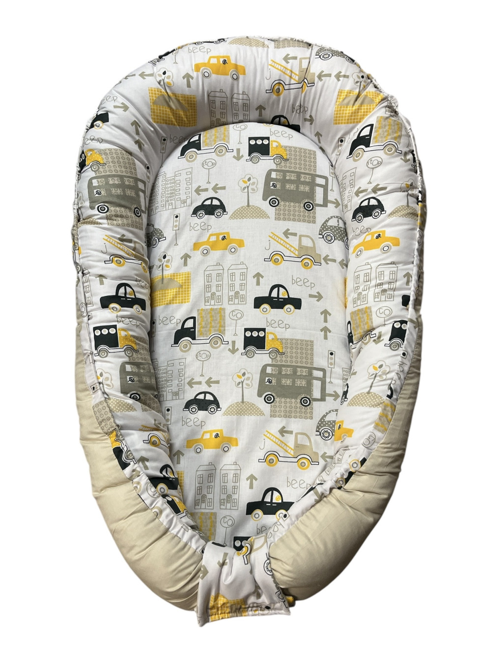 Kényelmes és bíztonságos az újszülött babáknak az első napjától kezdve. Megkönnyiti a mindennapokat: otthon és az utazásnál egyaránt hozzájárul a nyugodt pihenéshez. A megkötő tépőzáras pánttal van eltakarva. A kókusz betét még kényelmesebbé teszi a baba számára a pihenést. A termék külső és belső anyaga 100% pamut , a töltet 100% polyamid.