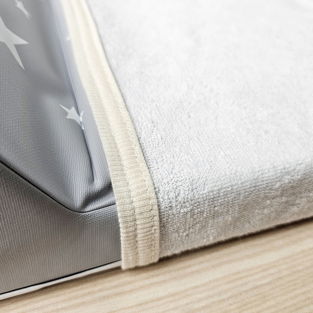 Frottír védőhuzat vízzáró filmréteggel a hátoldalán 70x50-es pelenkázólapra és babafészekhez. A huzat mérete 70x30cm. A pelenkázólap hátulján gumiszalaggal rögzül, könnyen levehető és visszatehető. Mosógépben 30 fokon mosható.