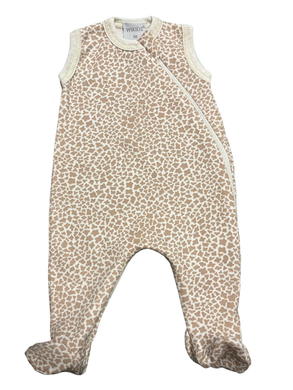 56-os méretű, cipzáras, ujjatlan, pamut Wikids rugi. 100% pamut anyagú. Mosógépben 30°-on mosható.