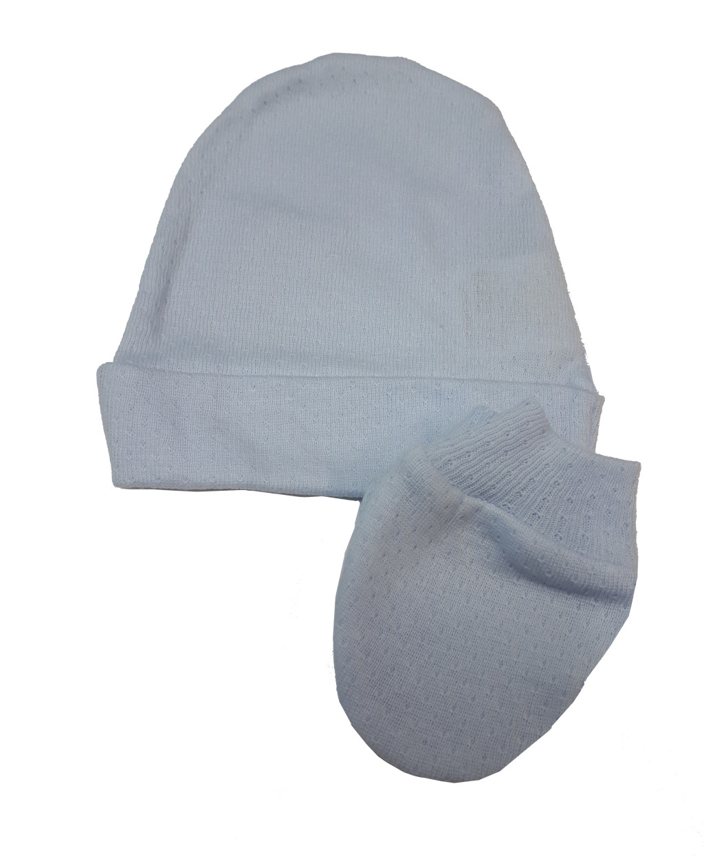 Wikids újszülött sapka-kesztyű szett. Ideális az első napokra, hetekre. 100% pamut. 30°C-on mosógépben mosható.